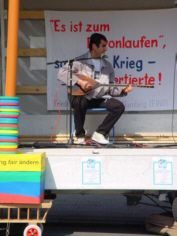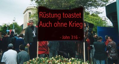 Diesem Eindruck verschaffte auch der zum wiederholten Male extra aus Stuttgart angereiste Kirchen-Comedian "Küster Frank" Luft, als er seine kongeniale Mister Bean-Imitation vor einem Transparent mit der Aufschrift "Es ist zum davonlaufen" abhielt ... Die rückläufige Tendenz der zur Teilnahme bereiten Demonstranten geht nach Meinung der Organisatoren vor allem auf die verstärkte Präsenz der Chauvinisten-Front Karlsruhe im ATK zurück, die während der gesamten Tage fortlaufend demagogische Flugblätterverteilte, mit denen sich beim besten Willen niemand mit gesundem Menschenverstand identifizieren kann ...