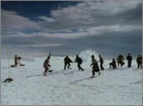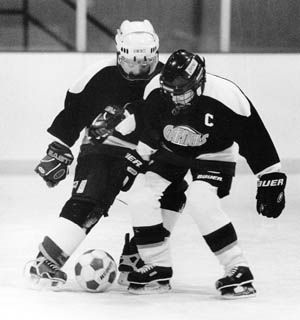 Bodycheck beim "Käpt'n Iglo-Cup 2002": Kamerad Ollo "FixFlitz" Dingens (Schwarzer Helm) im Clinch mit Peter "The Testtube" Möller (Weißer Helm)